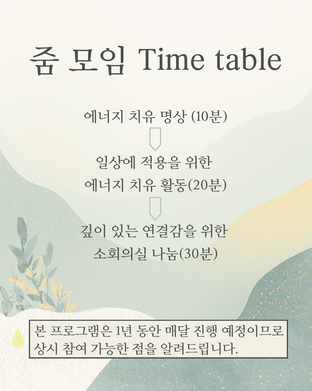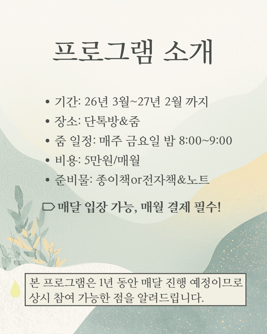 - 각 월 모임 시작일부터 환불되지 않습니다.